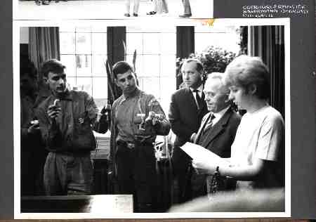 Dans son allocution, le maire Kauermann revint d'abord sur l'histoire et les origines du mouvement scout. Ensuite il se réjouit des bons contacts amicaux entretenus par Vincennes et Castrop-Rauxel. kauermann souhaita que les deux groupes scouts restent longtemps en contact et ajouta: "J'espère que nos invités emporteront avec eux en France un bon souvenir de notre ville et de notre pays." Il n'y avait pas de difficultés de communication. A la dernière minute, on trouva un traducteur, mis à la disposition des scouts. Le chef d'unité des scouts de Vincennes remercia au nom de tous les scouts français pour l'accueil très chaleureux qui leur fut réservé. Il lut ensuite la lettre du maire de Vincennes, monsieur Bonnemain, dans laquelle il était entre autre écrit: "Les scouts seront de bons messagers pour vous apporter les meilleures salutations de toute la population vincennoise." Nos jeunes vont certainement beaucoup profiter de leur séjour chez vous. Ils doivent aussi accorder une grande attention aux liens amicaux entre nos deux villes, et les honorer comme il se doit."