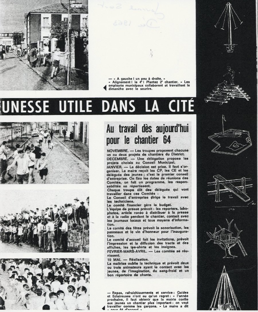 Cette opération a donc entraîné partout en France, et en particulier dans le Val de Marne, la mise en oeuvre de nombreux chantiers menés par des troupes scoutes. On trouvera ci-dessous des documents concernant des troupes du Val de Marne, la plantation d'arbres par les scouts de Saint-Maur dans une rue de la ville (voir ci-dessous) ou encore les travaux d'adduction d'eau menés en particulier par les scouts de Champigny et de Fresnes dans un petit village du Gard, Sénéchas (voir ci-dessous), mais d'autres projets qui sont décrits par ailleurs sur le cédérom ont sans doute été définis dans le cadre de cette opération Entreprise 62, comme le nettoyage du bois de Vincennes par des jeunes de toute la région, la construction du clocher de l'église Notre-Dame de Lourdes par les pionniers de Choisy le Roi en 1964, le projet Scouts contre la faim, toujours en 1964. Parmi ces réalisations, on peut encore mentionner les travaux préparatoires à la réalisation d'une aire sportive près du carrefour Pompadour à Créteil réalisés par les scouts de Créteil en 1965.