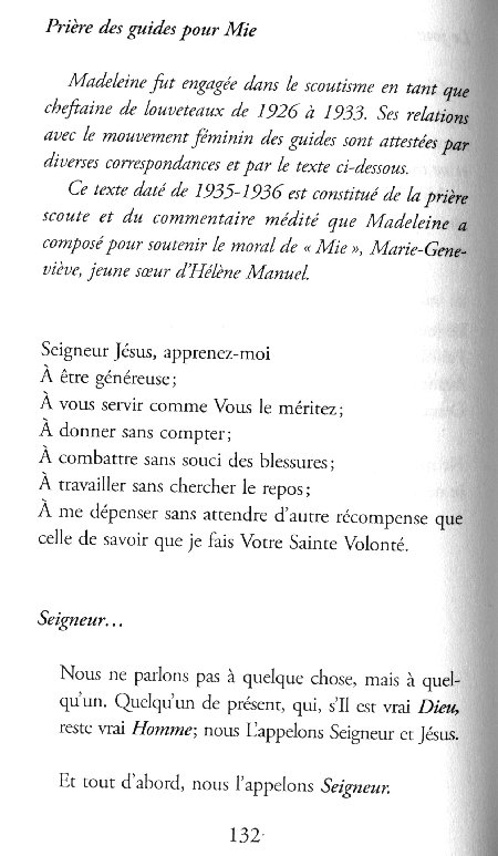 Après avoir été cheftaine de louveteaux sur Paris et responsable de la formation de cheftaines dans le district Paris-Sud auquel ont appartenu les groupes de Rungis, Fresnes, Cachan, Gentilly et Thiais, Madeleine Delbrêl qui était alors à Ivry sur Seine, avait rédigé des commentaires sur la prière scoute à l'intention d'une de ses amies qui était gravement malade (commentaires publiés dans le tome 3 de ses oeuvres complètes, Humour dans l'amour, aux Éditions Nouvelle cité, 2005) :