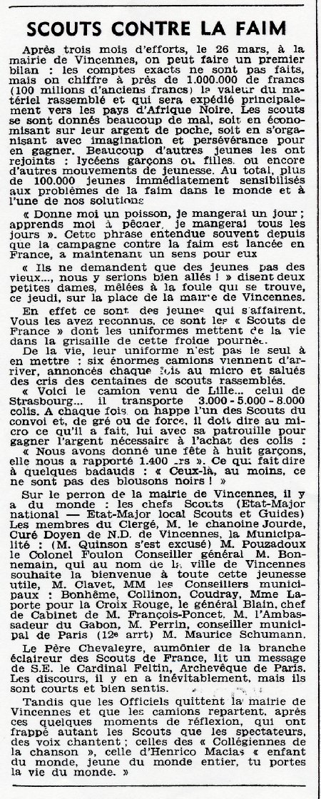 En 1964, les scouts de France avaient participé à une action humanitaire concernant la collecte de matériel destiné aux pays d'Afrique noire. Vincennes avait été le point de départ du convoi qui devait acheminer les produits récoltés vers leur destination finale. Au moment du départ, une animation avait été organisée et Enrico Macias était venu chanter sur les marches de la mairie. La société UNIC (fabricant de camions) était parmi les sponsors de l'opération. Plusieurs unités du Val de Marne avaient participé à l'opération comme on va pouvoir le voir ci-dessous.