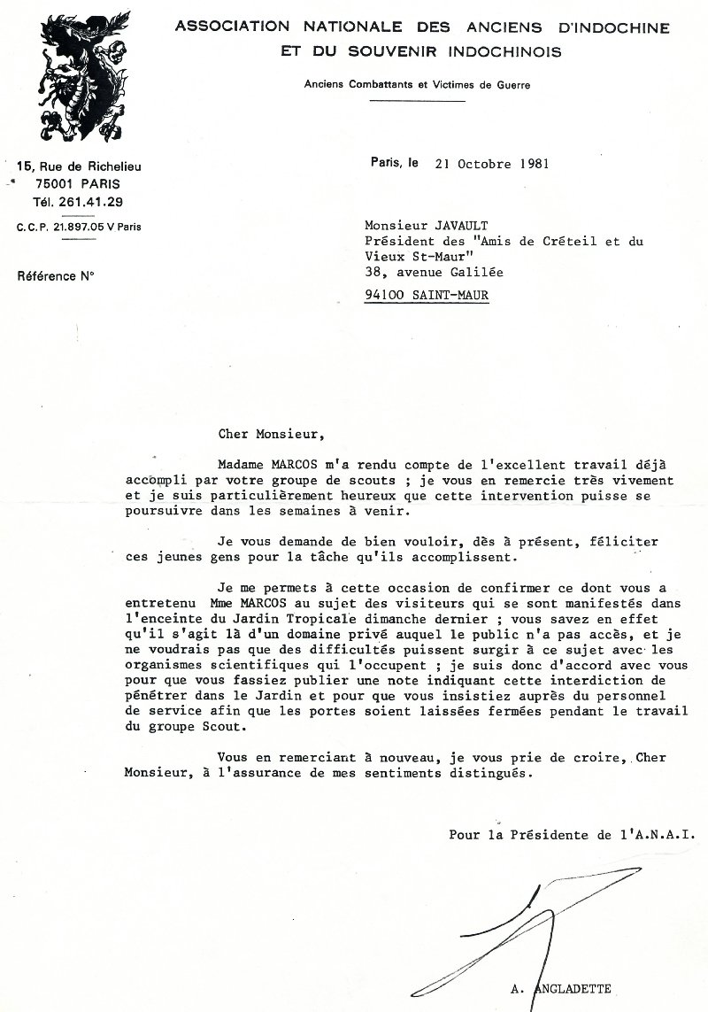 Les scouts de Saint-Maur, en 1981, ont participé aux travaux qui ont été effectués dans le temple du souvenir indochinois situé dans le bois de Vincennes. Ce temple, en 1979, avait été laissé à l'abandon depuis quelques années. Une étude avait alors été menée pour le remettre en état et on trouvera ci-dessous un extrait du document "Quelques réflexions sur le Temple du Souvenir Indochinois et sur son environnement, le Jardin Tropical" rédigé par Bernard Javault, président de la Société d'Histoire et d'Archéologie de Saint-Maur (et également ancien chef de groupe de Saint-Maur) . Dans ce rapport, on peut lire qu'il était proposé qu'une dizaine de scouts participent aux travaux. (Michel Joly, mentionné sur le document, était le chef de groupe de Saint-Maur à l'époque).