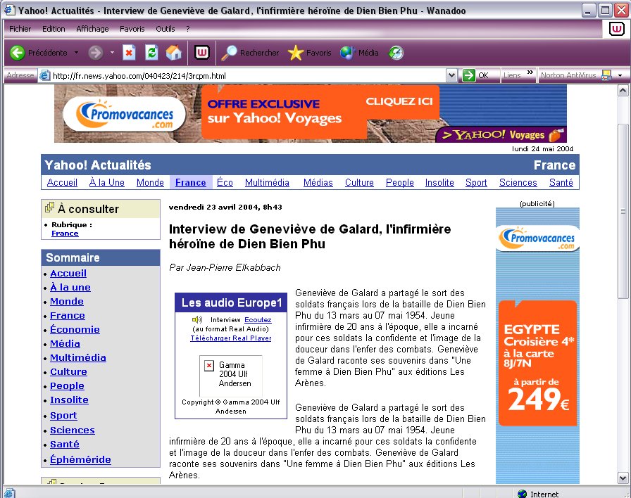 Geneviève de Galard, 28 ans, ne comprend pas ce qui lui arrive. "La France accueille l'héroïne de Dien Bien Phu", titre l'hebdomadaire. Les Etats-Unis la surnomment "l'Ange de Dien Bien Phu". Encore ignorante de cette effervescence médiatique, elle ne sait qu'une chose : la voilà libre, sortie de l'enfer, d'une histoire de boue et de feu, de souffrance et de mort. Elle n'oubliera jamais l'odeur et les cris de la défaite, le 7 mai, l'immense champ de bataille crépusculaire perdu dans la jungle indochinoise, les plaintes des blessés, le souffle court des agonisants et la puanteur des cadavres abandonnés. Au terme d'un siège de plusieurs semaines, la France a rendu les armes et son bilan se passe de commentaire : on recense 3 420 tués et disparus et autant de blessés parmi les assiégés. Le vainqueur, personnifié par le général Giap, capture près de 11 000 prisonniers.